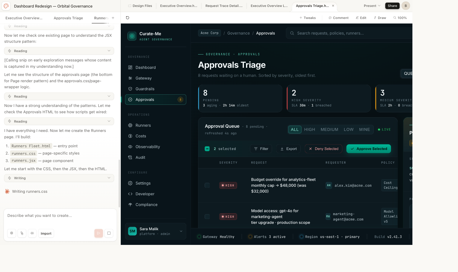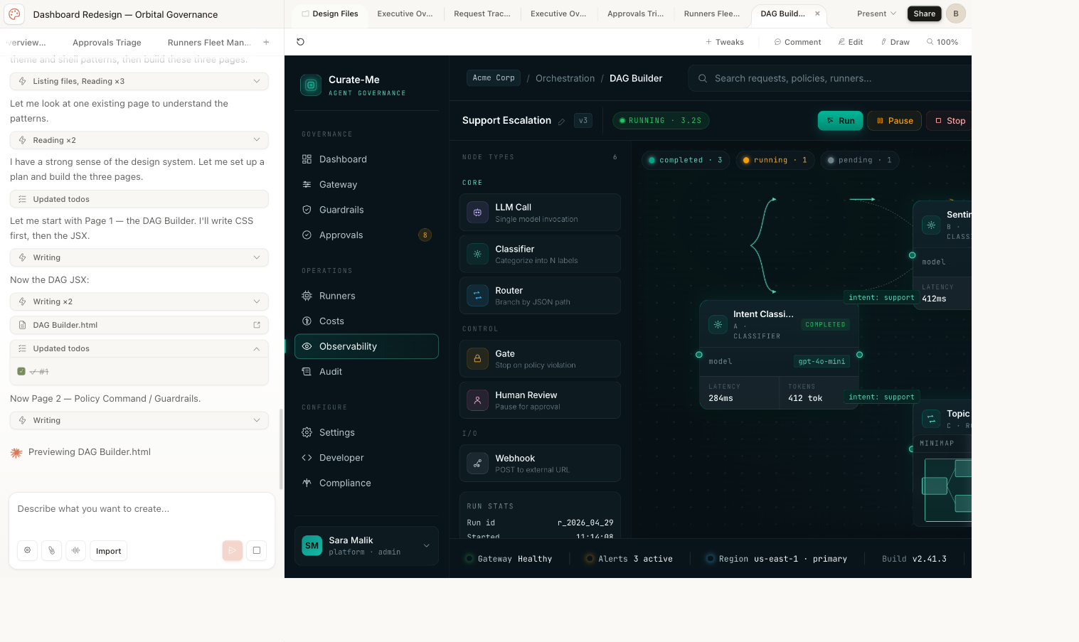 First batch: Executive Overview, Request Trace, Approvals, Runners Fleet. Second batch: DAG Builder, Policy Command, Costs, Settings, Audit Logs, Onboarding, Login/Signup, Empty States, Component Library.
