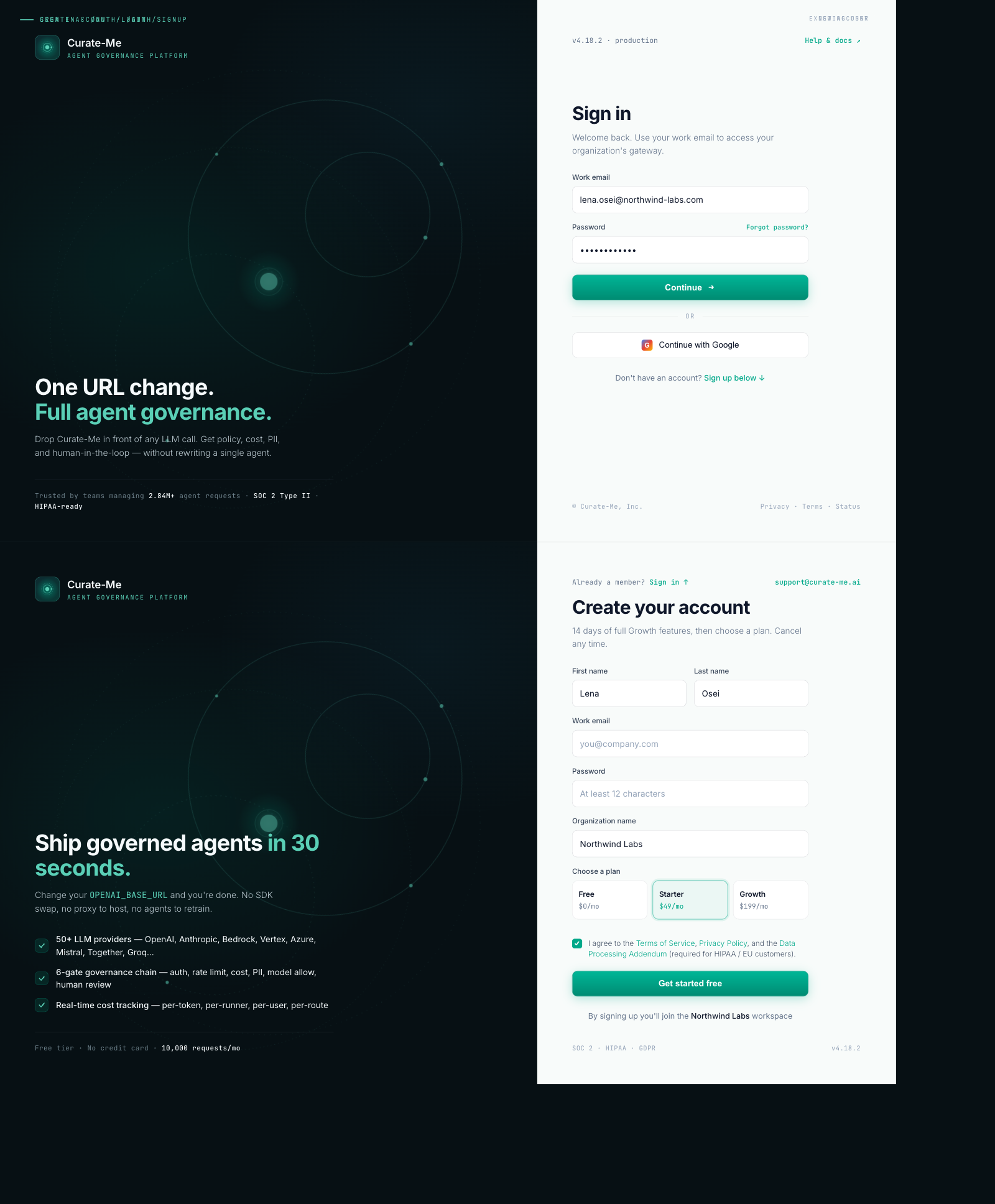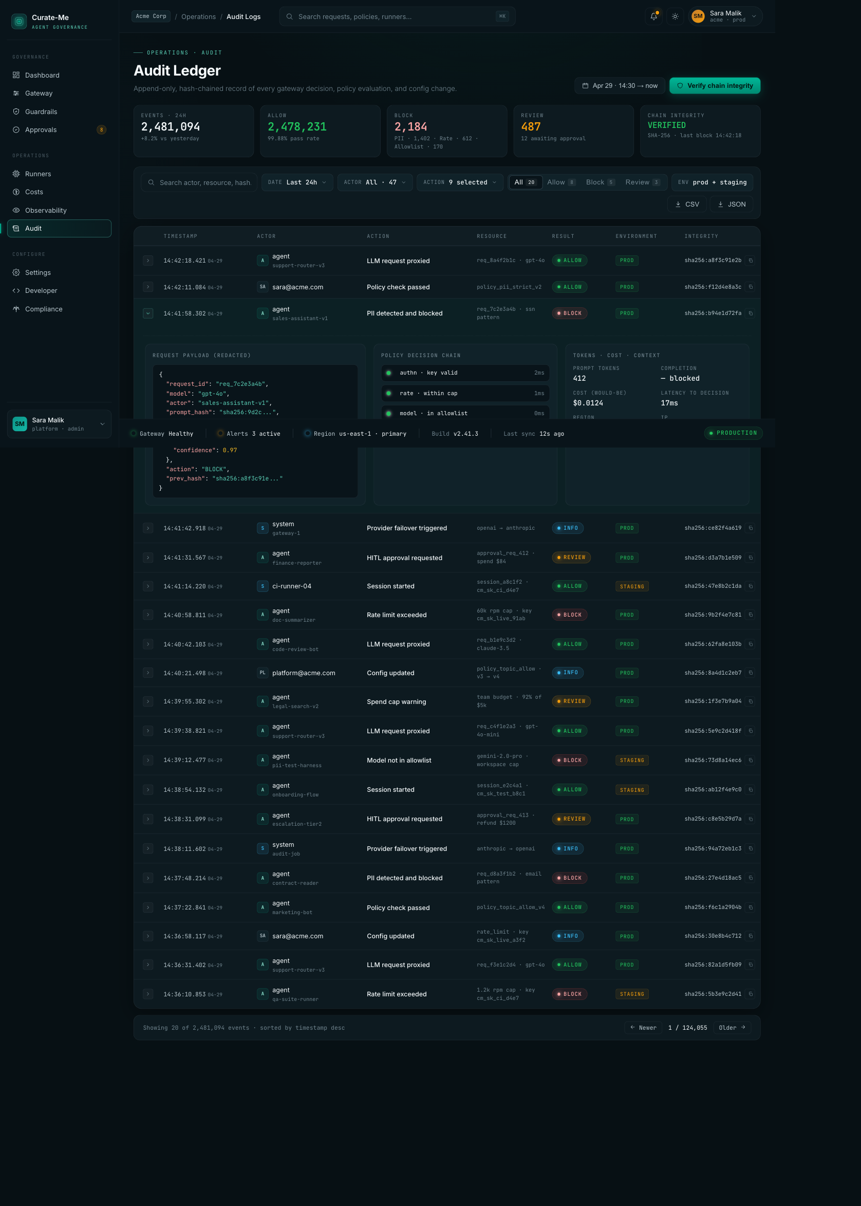 Audit Logs -- 2.4M events with hash-chain verification, expandable rows showing request payloads and policy decisions.