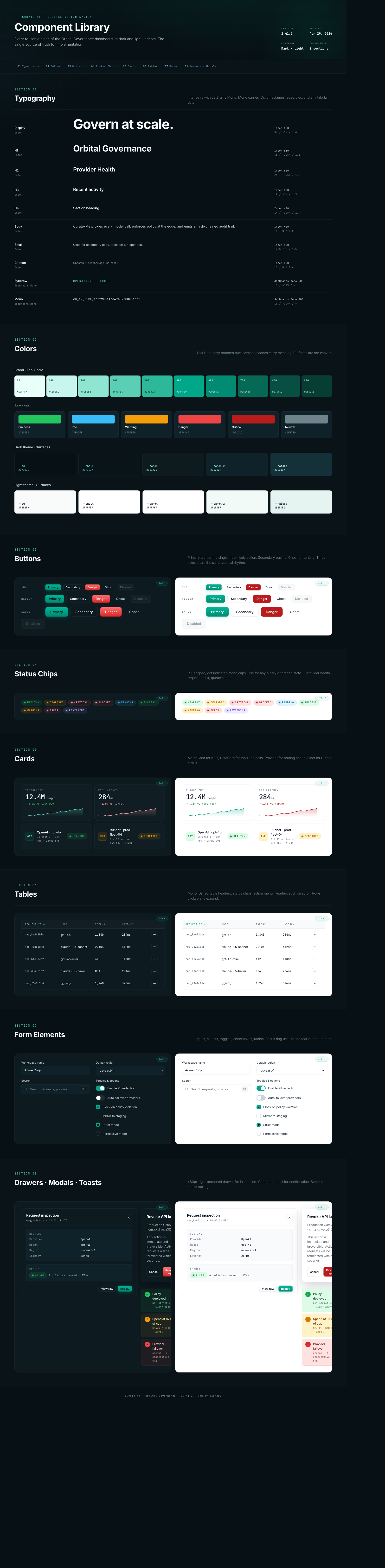 Component Library -- typography, colors, buttons, chips, cards, tables, forms, drawers -- the full system in dark and light.