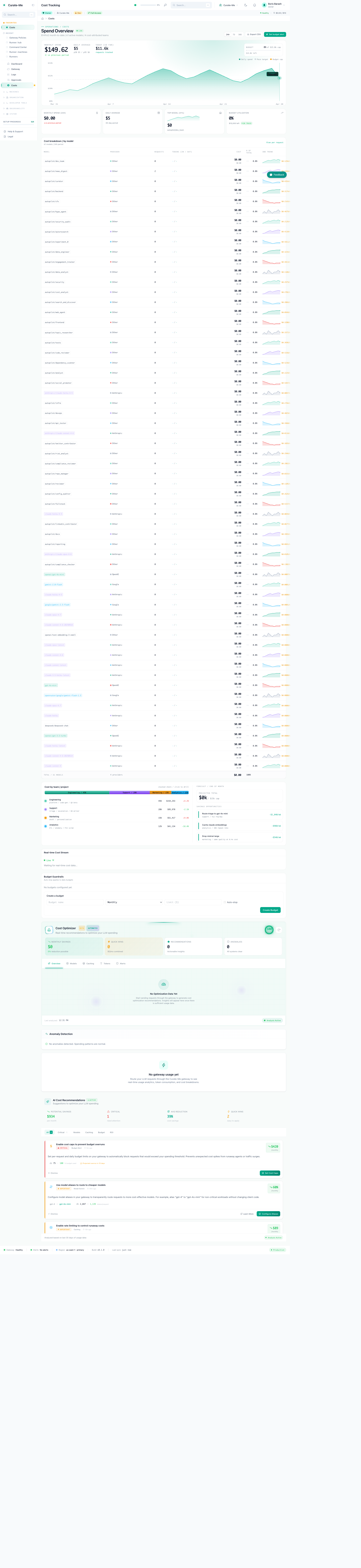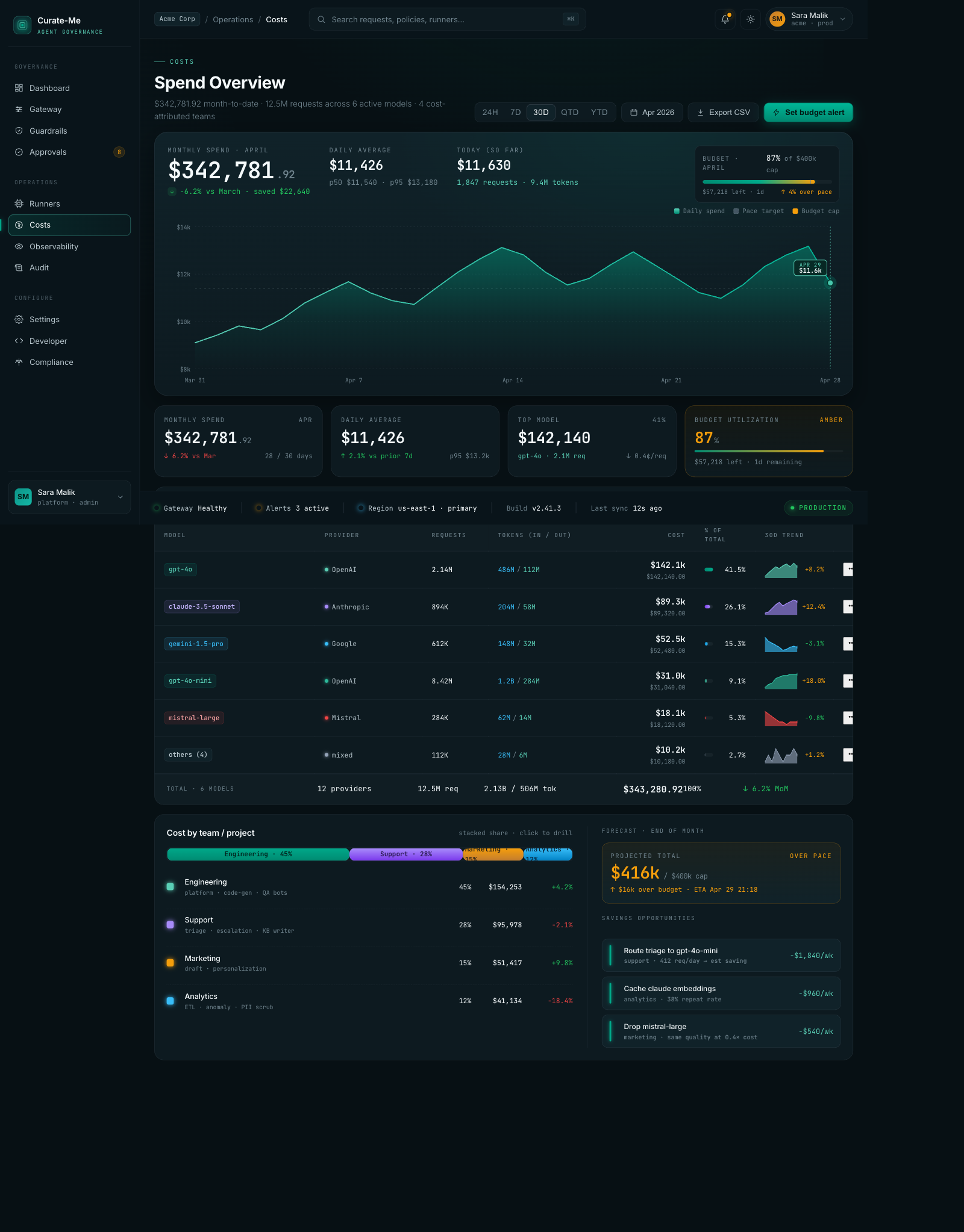 Costs -- monthly spend chart, model cost breakdown with sparklines, team attribution bar, savings recommendations.