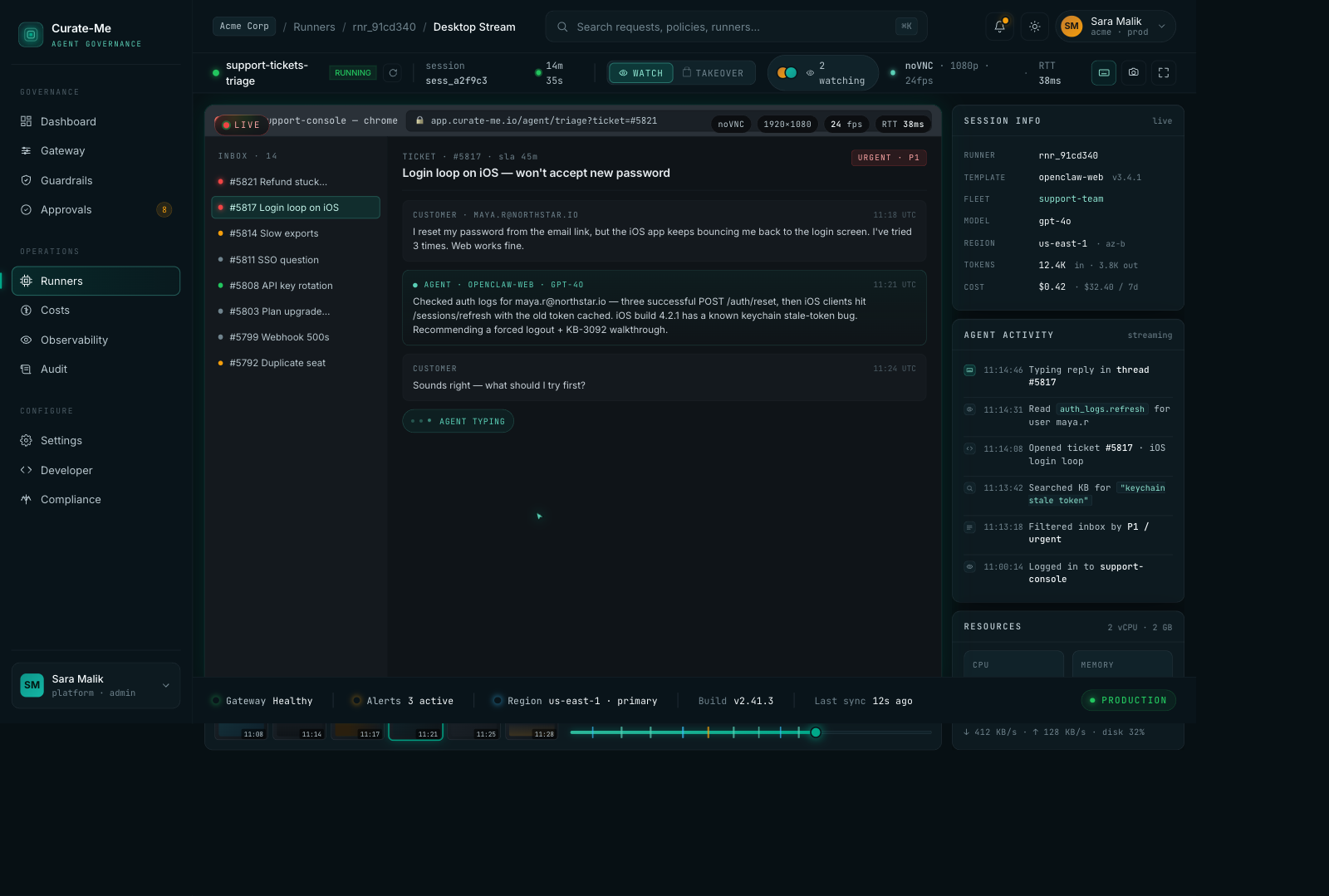 Desktop Stream -- live viewer with ticket inbox, agent activity timeline, resource monitors.
