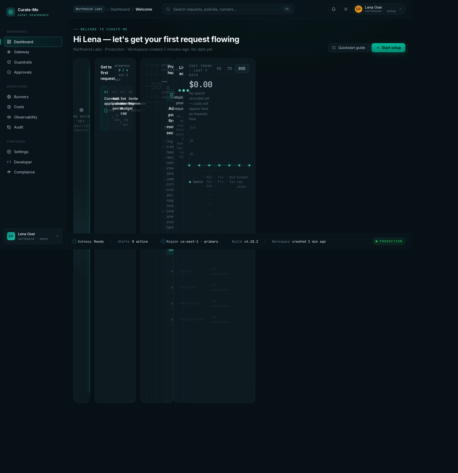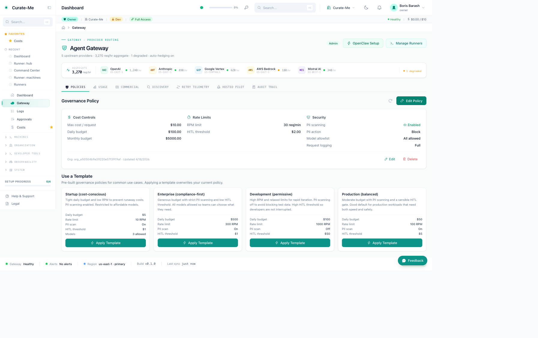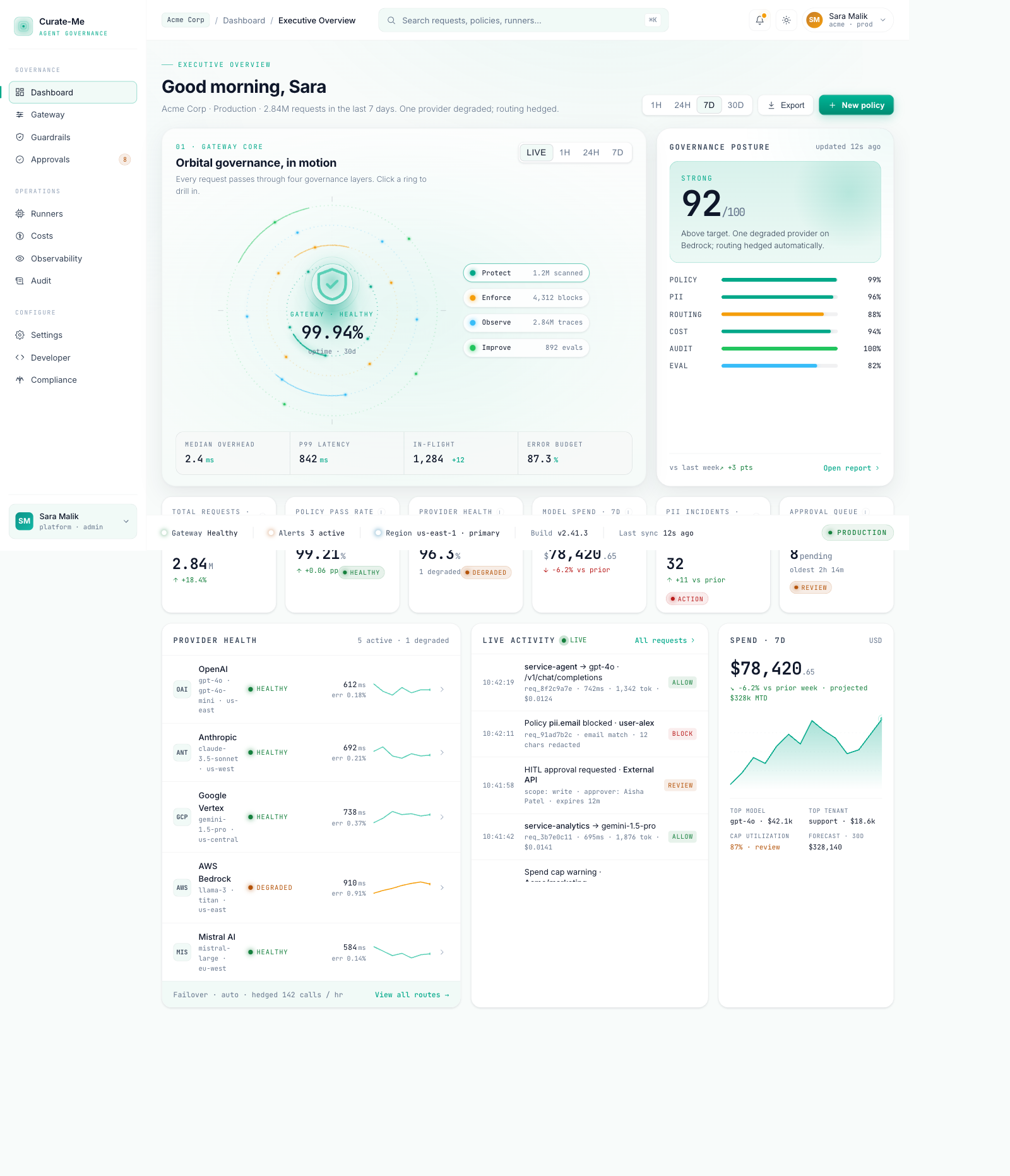 Executive Overview -- concentric ring animation, governance score card, six KPI metrics, provider health sparklines, activity feed, cost trend.