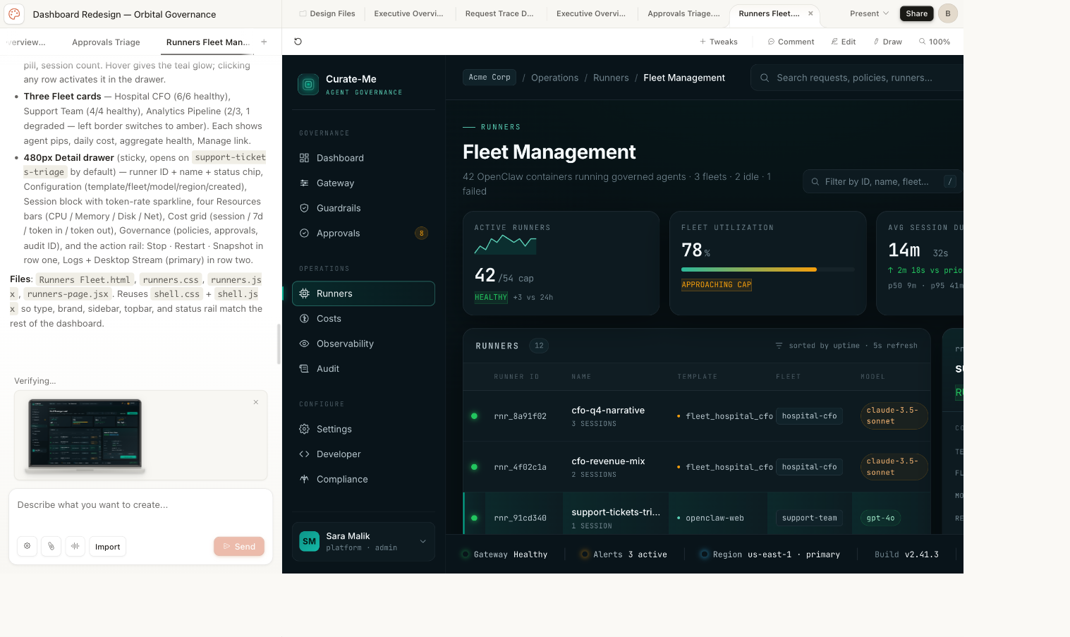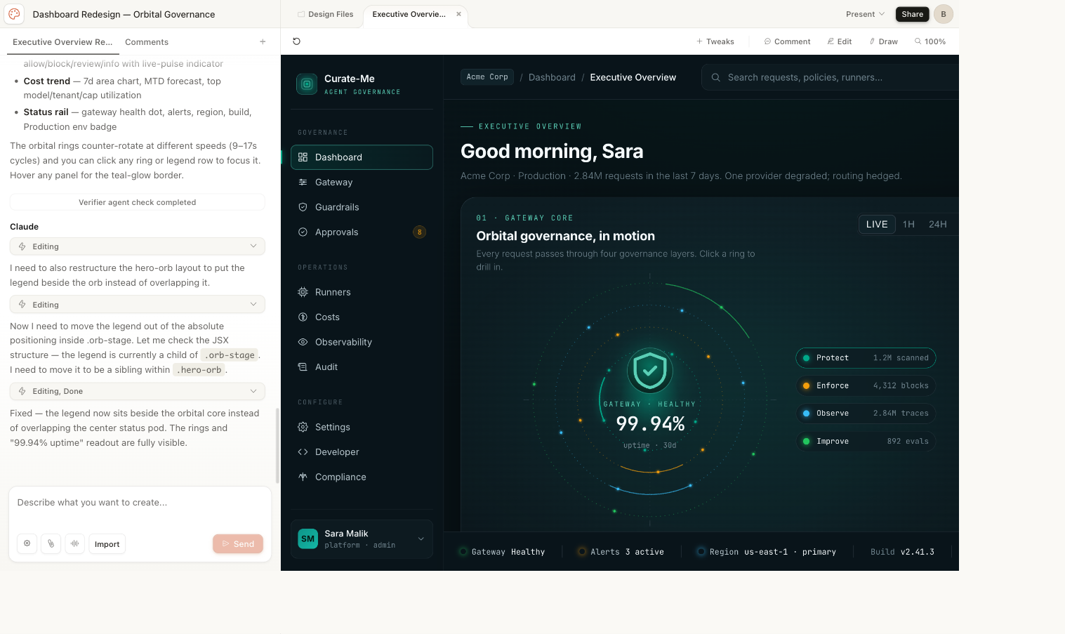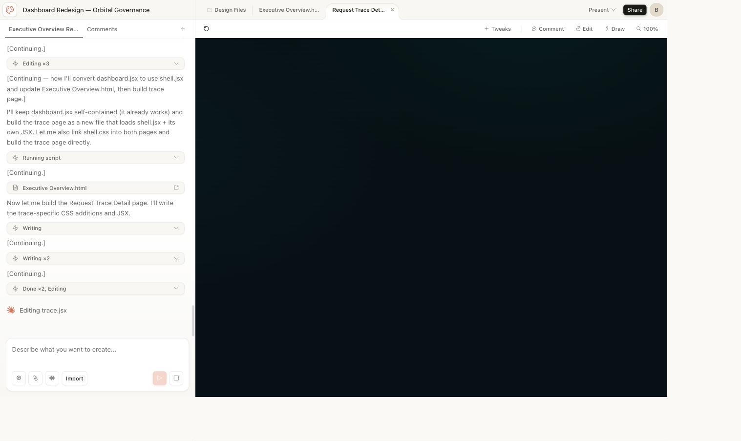 We had an 83-page dashboard that worked fine but looked like it was designed by committee -- because it was. The design system came from a ChatGPT session: a token table, a component inventory, 26 reference images, and a full spec with names like "Orbital Governance System." Dark backgrounds, concentric ring motifs, data-dense layouts in the Linear/Datadog family. The aesthetic was defined. Nothing was built.