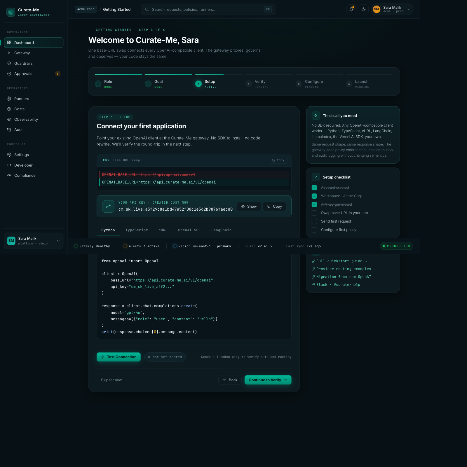 Onboarding -- six-step wizard with code snippets, setup checklist, framework tabs.