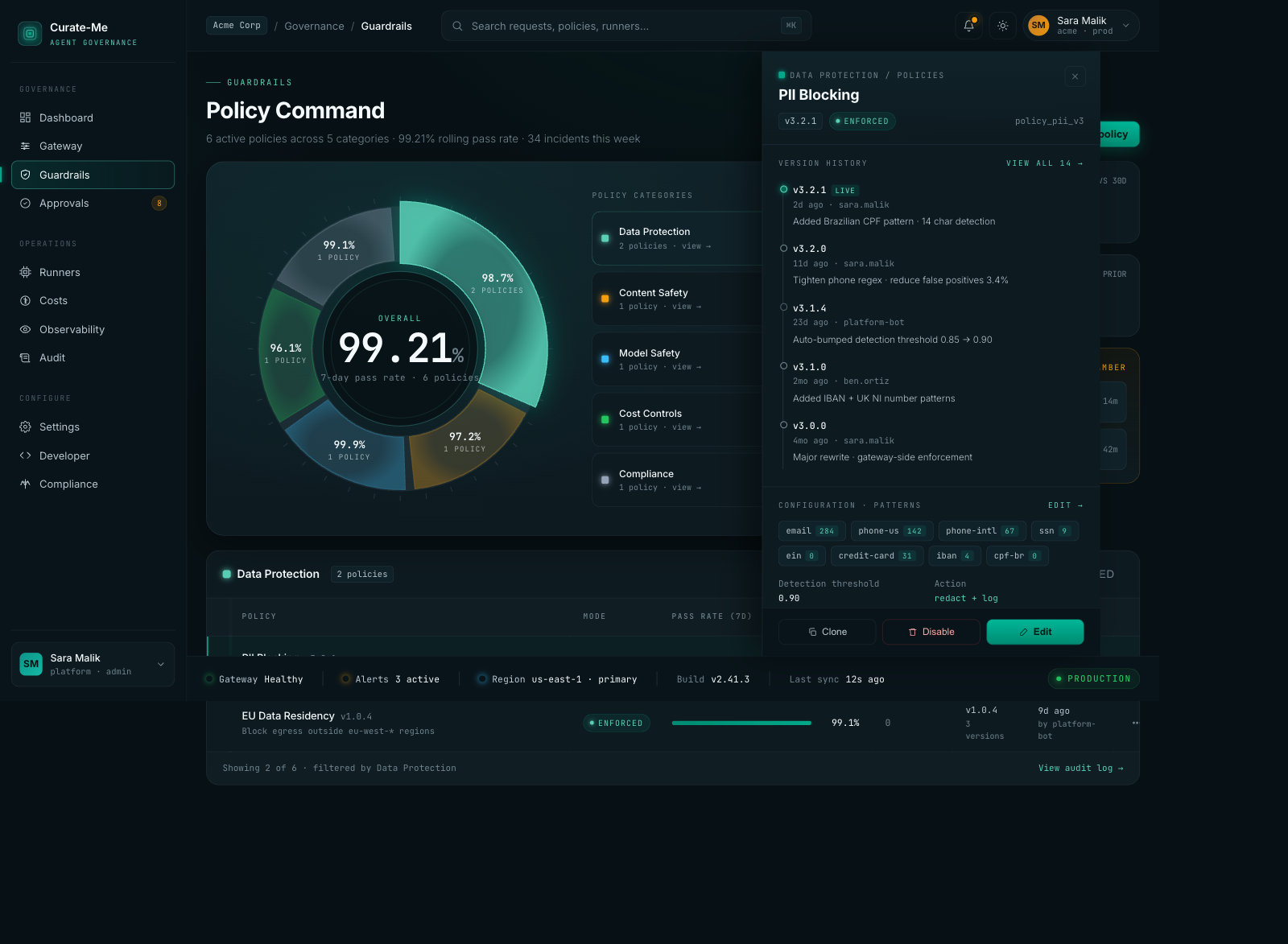 Guardrails -- donut chart showing policy categories, PII Blocking drawer with version history and pattern config.