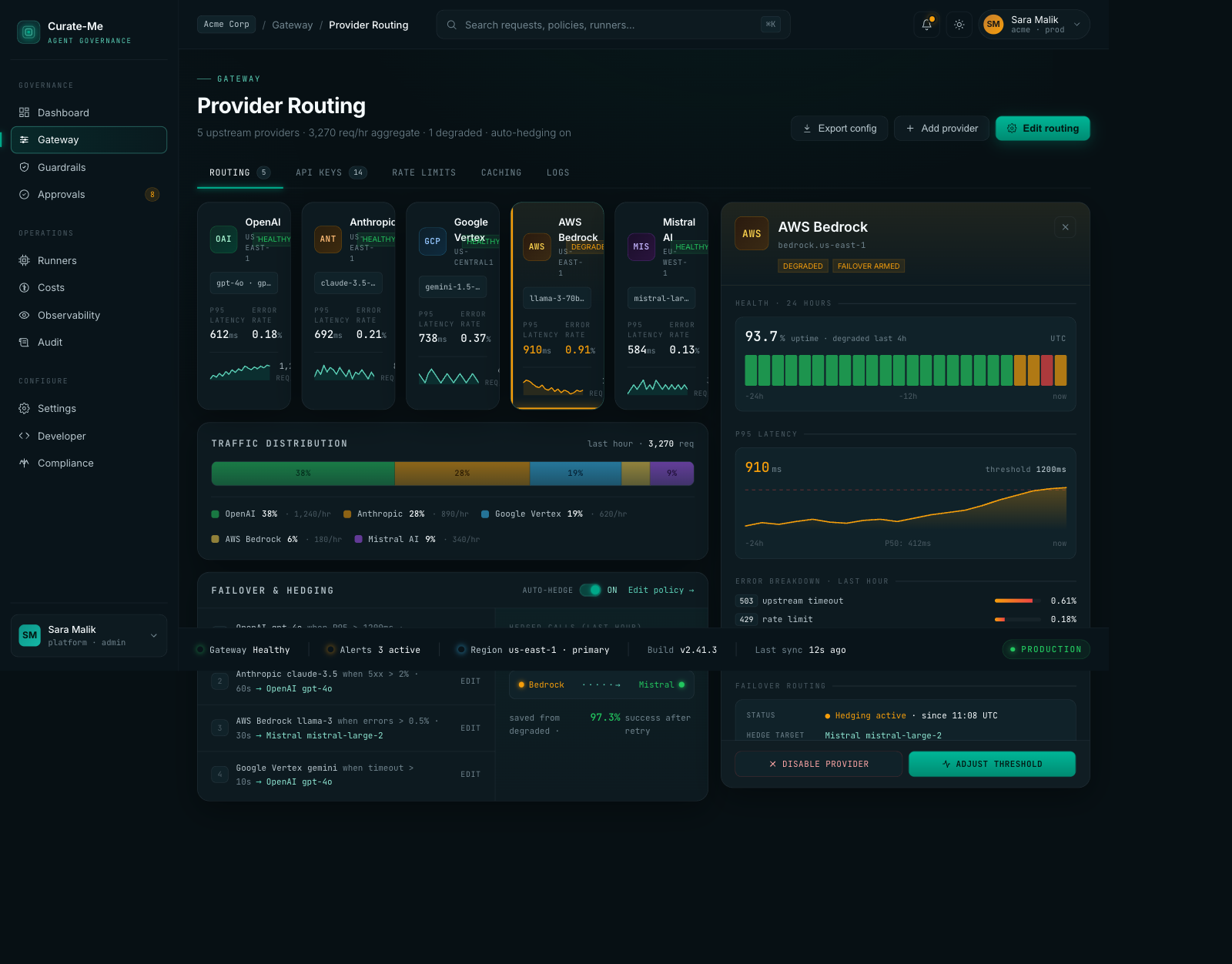 Provider Routing -- five provider cards with health stats, traffic distribution bar, failover rules, a detail drawer with latency curves and error breakdowns.