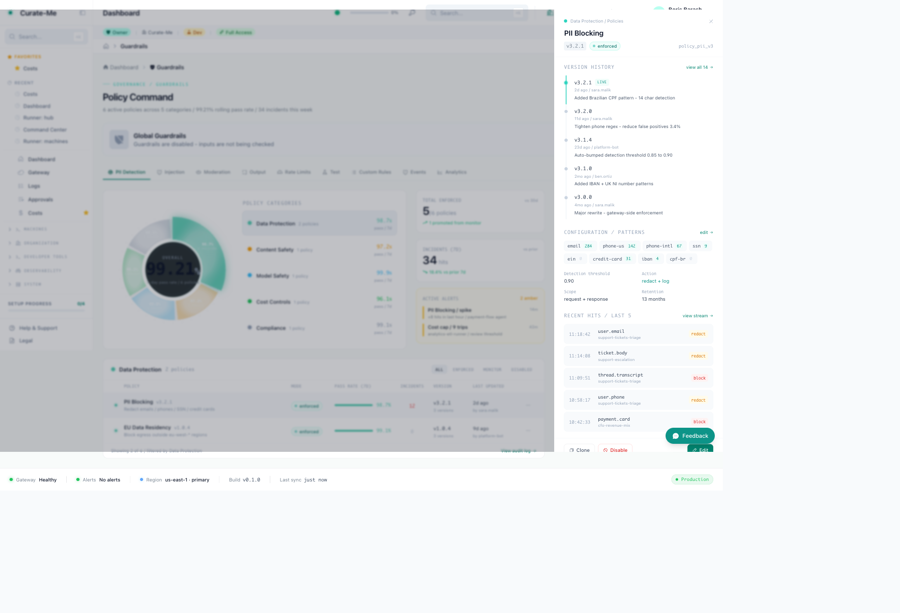 Guardrails. The donut chart translated almost perfectly. The PII Blocking drawer with version history shipped correctly. This was the closest match between design and production.