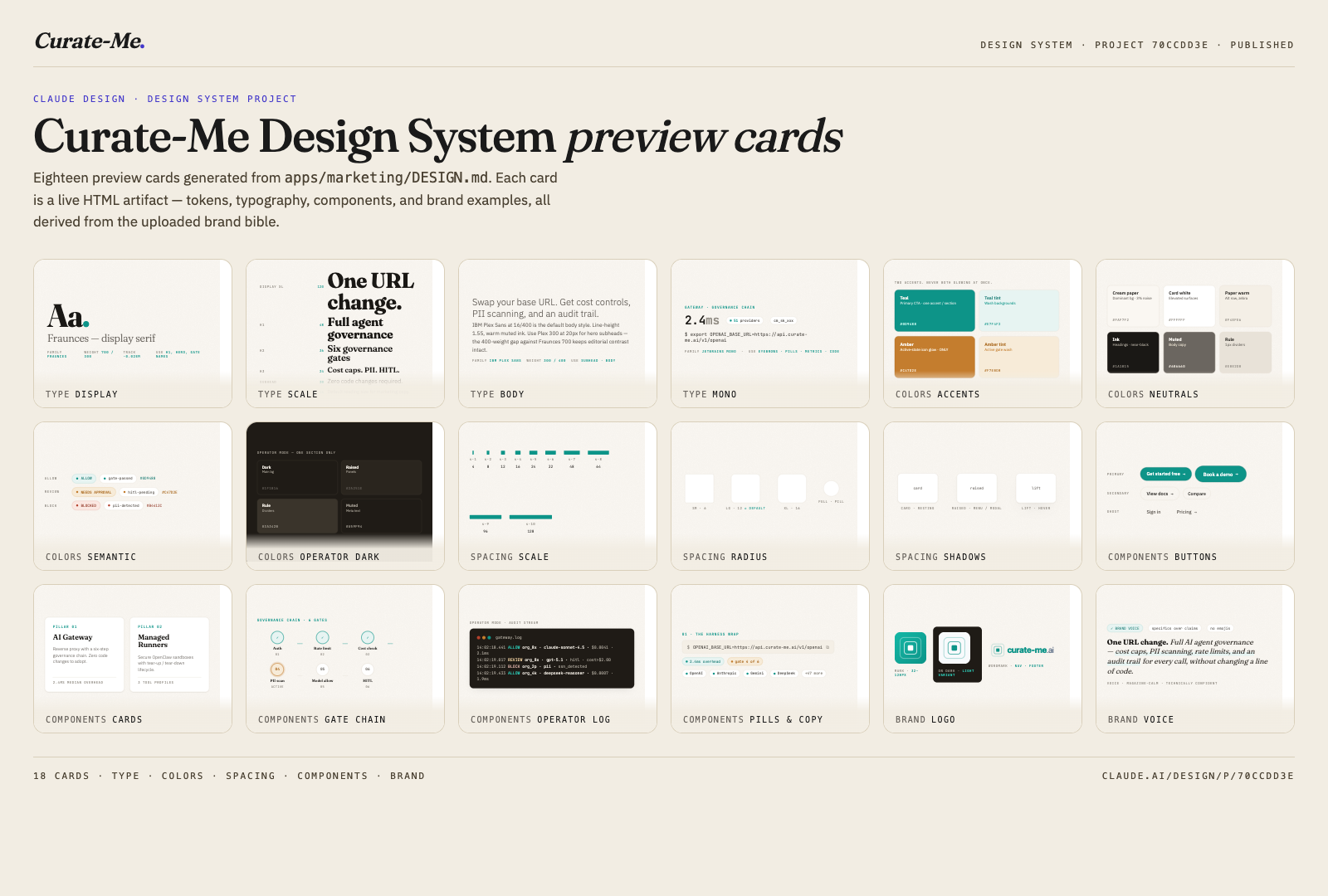Claude Design — Generated the Curate-Me Design System project, ui_kits/marketing/index.html, colors_and_type.css, 18 preview cards