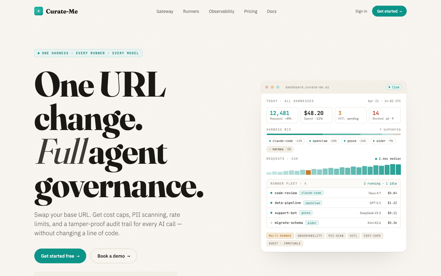 Halfway through the session it became clear why. Those products sit between an app and a model provider. Curate-Me sits above agent harnesses — coordinating runners, governance, fleet management — not between the app and the LLM. Comparing against Portkey is like a fleet management system comparing against a fuel card processor. The category is adjacent; the function is not.