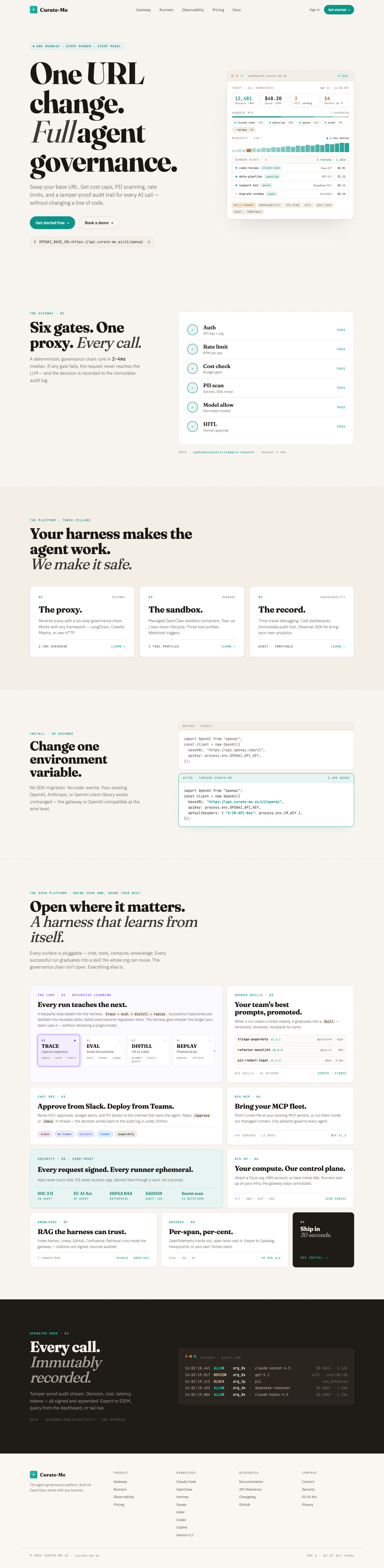 The fonts that shipped were Fraunces for display — 700, italic pivot on key verbs — IBM Plex Sans for body, and JetBrains Mono for eyebrows and latency pills. The palette: cream #FAF7F2 base, warm near-black #1A1815 ink, teal #0D9488 for CTAs, amber #C47D2E for active states, warm #E8E2D8 for rules. The H1 that shipped: "One URL change. Full agent governance." Fraunces 700, italic pivot on Full.